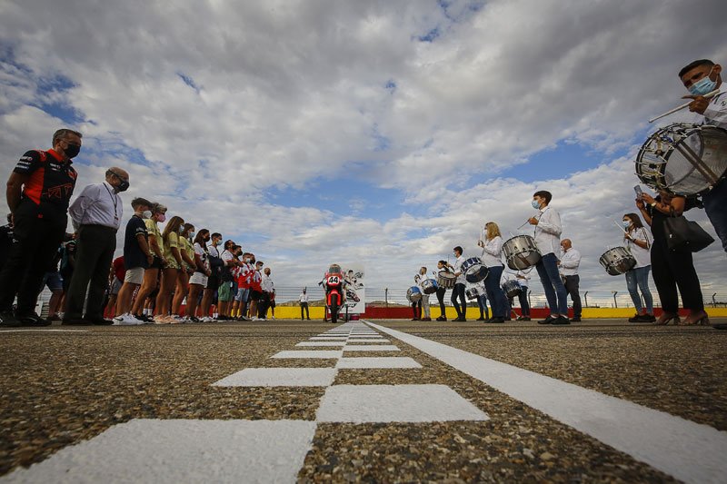 Sur la ligne droite principale du MotorLand, la famille d’Hugo Millán a été rejointe par les membres du paddock, dont le PDG de Dorna, Carmelo Ezpeleta, le président de l’IRTA, Hervé Poncharal, et des pilotes de chaque catégorie de Grand Prix, ainsi que le personnel et les officiels du MotorLand Aragón , dont le PDG du circuit, Santiago Abad, pour lui rendre hommage.