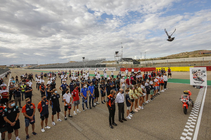Sur la ligne droite principale du MotorLand, la famille d’Hugo Millán a été rejointe par les membres du paddock, dont le PDG de Dorna, Carmelo Ezpeleta, le président de l’IRTA, Hervé Poncharal, et des pilotes de chaque catégorie de Grand Prix, ainsi que le personnel et les officiels du MotorLand Aragón , dont le PDG du circuit, Santiago Abad, pour lui rendre hommage.