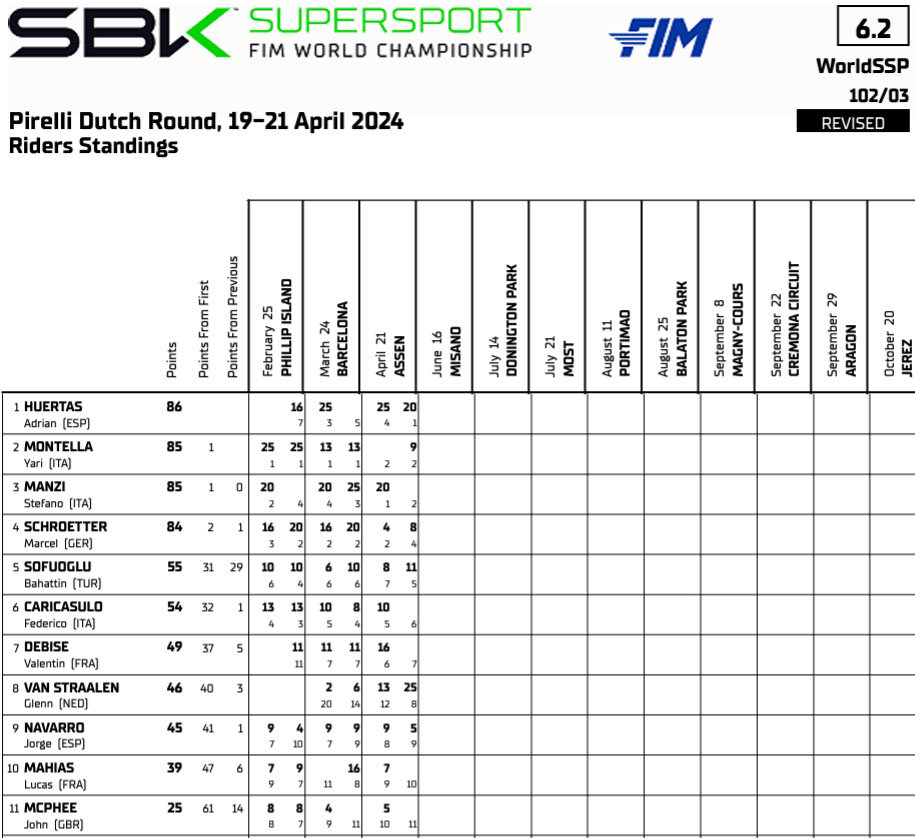 • L’Espagnol Adrian Huertas (Aruba.it Racing WorldSSP Team) mène le championnat avec 86 points.