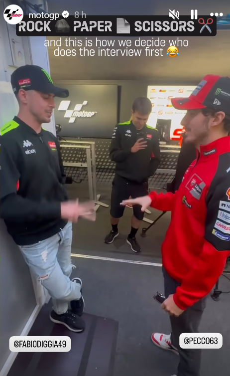 - Francesco Bagnaia et Fabio Di Giannantonio voulaient tous les deux aller aux interviews au même moment au Mans. Ils ont donc décidé de celui qui remplirait ses obligations médiatiques en premier en jouant à Pierre, Papier, Ciseau. Duel que le champion du monde en titre a remporté.