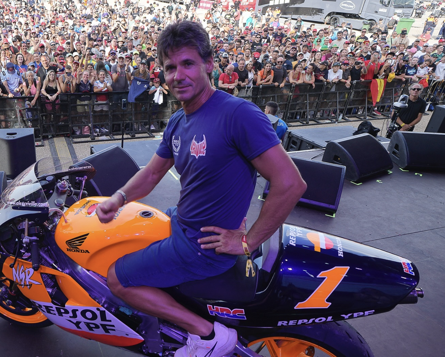 Le champion du monde 500cc de la saison 1999, Alex Crivillé, était de retour à Aragon. À l’occasion du 75e anniversaire de son sacre mondial, l’Espagnol a repris le guidon de sa Honda sur le tracé d’Aragon pour y effectuer quelques tours de piste devant ses fans. Aujourd’hui âgé de 54 ans, le Catalan a donc pris le guidon de sa NSR 500, pour montrer à ceux qui voulaient le voir qu’il n’avait pas totalement perdu ses réflexes. L’occasion pour ce dernier de faire un détour par la fanzone – comme le font les pilotes de MotoGP au cours d’un week-end de compétition classique – pour aller saluer ses supporters.