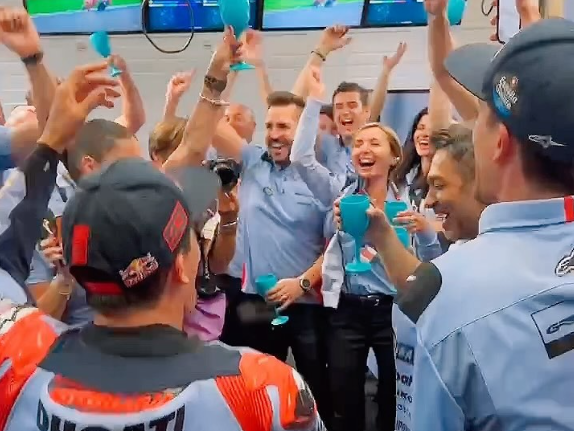 • Les festivités se poursuivent dans le box de Gresini Racing avec un hommage en chanson au team avec qui il vient de décrocher son premier podium.