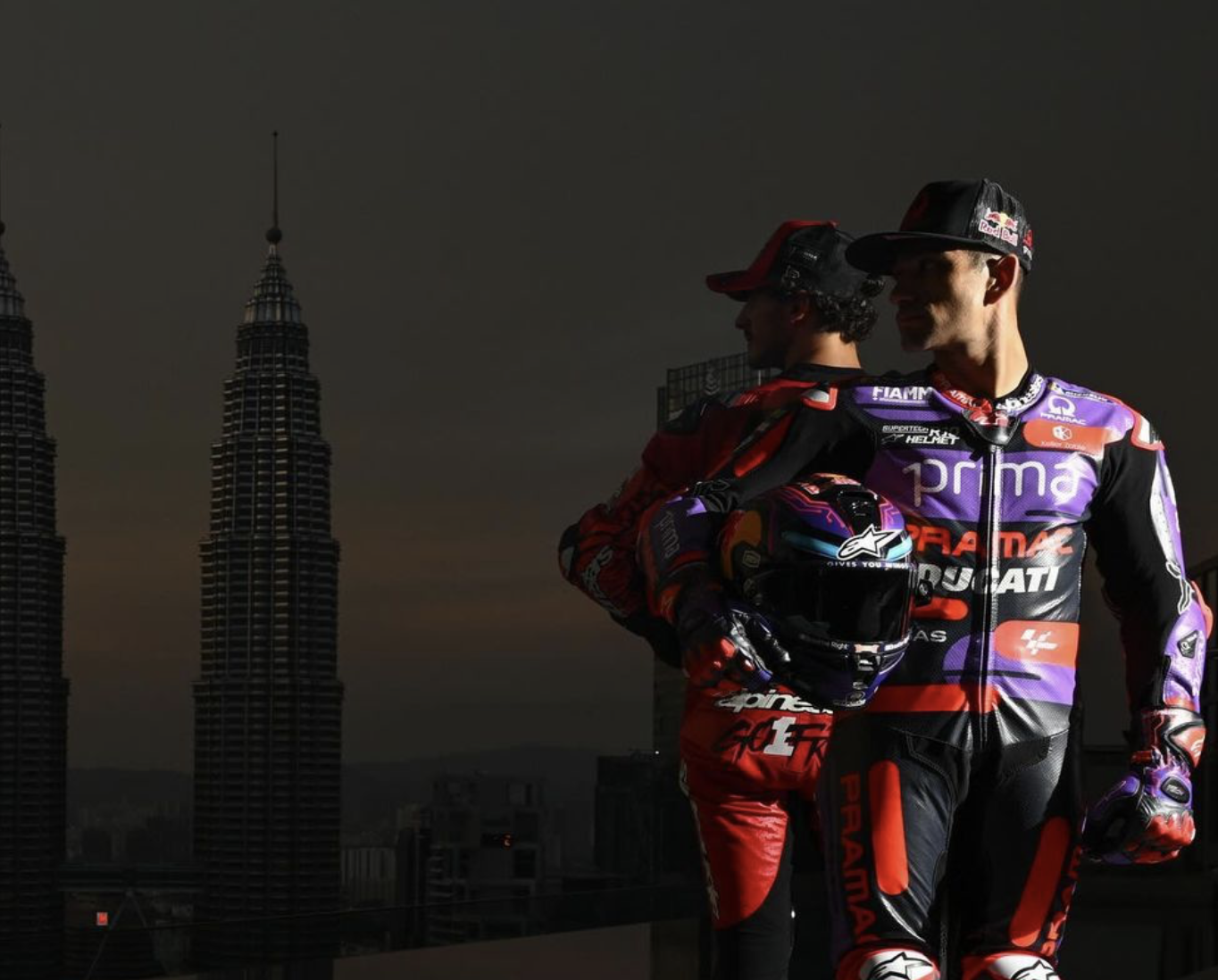 Alors qu’il est désormais officiel que le Championnat 2024 de MotoGP se jouera entre Jorge Martín et Pecco Bagnaia, les deux hommes se sont donnés rendez-vous dans un hôtel de Kuala Lumpur, pour immortaliser la preview de leur duel. Martin et Bagnaia ont ensuite profité chacun à leur manière du cadre dans lequel ils étaient invités pour réaliser cette séance photo. Le Grand Prix de Malaisie, disputé sur le circuit de Sepang, accueillera en effet le premier acte de cette finale pour le titre pilote, avant le match retour, censé être organisé à Valence. Un rendez-vous sur lequel on peut pour l’instant mettre un point d’interrogation étant donné les inondations qui ont frappé la ville.