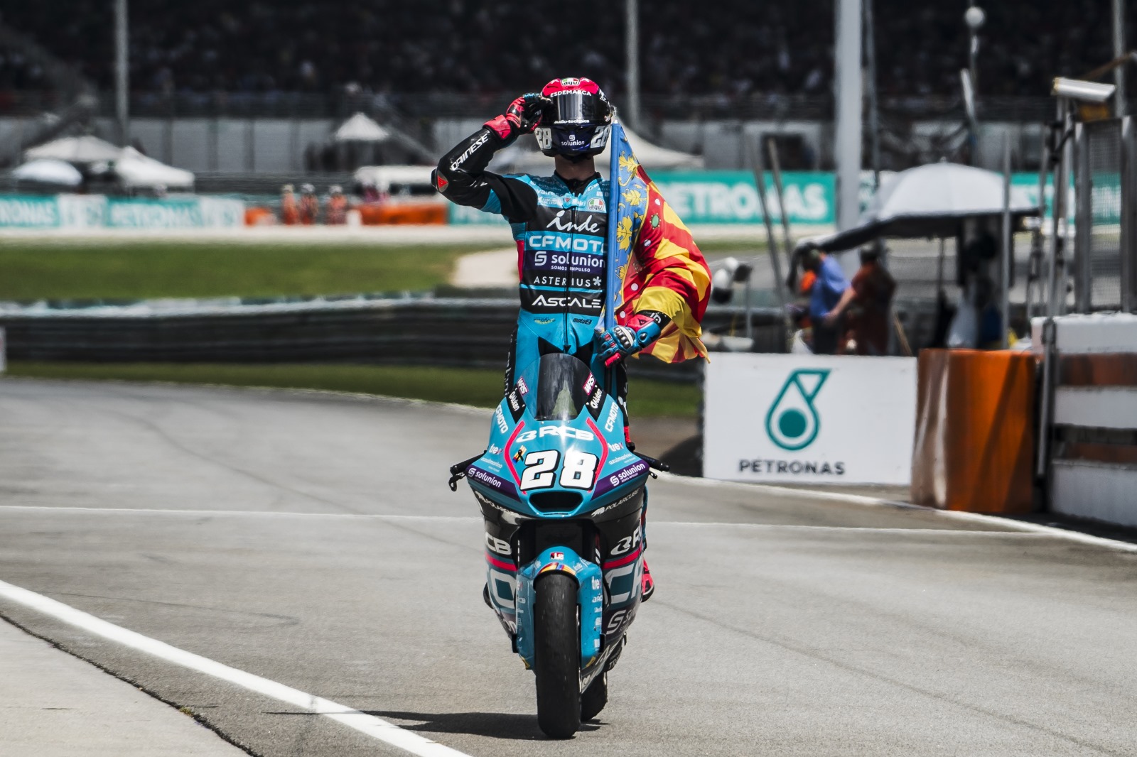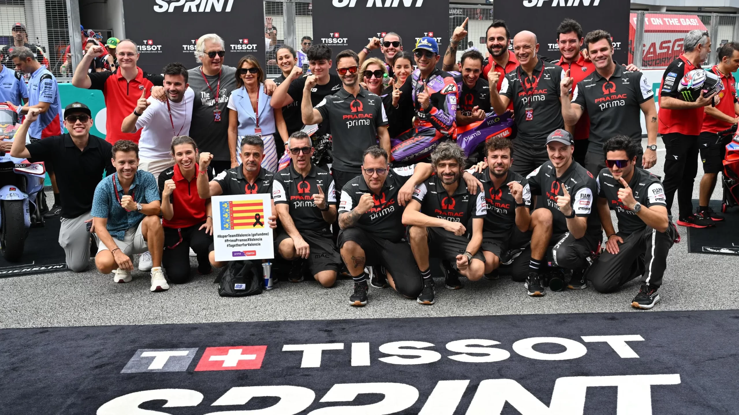 Dimanche dernier en Malaisie, les pilotes n’avaient pas la tête aux célébrations, et aucune bouteille n’a été ouverte sur les podiums des différentes courses. Les lauréats de chaque catégorie ont rendu hommage à la ville de Valence, touchée par de graves inondations, en ne célébrant pas sur la boite. Au terme de chaque épreuve du dimanche, le drapeau de la région flottait également entre les mains de différents pilotes, hispaniques ou non. À noter que le MotoGP a ouvert un fond de collecte pour venir en aide aux victimes de la région. La banque Sabadell, qui a ouvert le compte qui sert aux dons, à d’ailleurs promis de doubler chacun d’entre eux. Toutes les informations concernant ce fond de collecte disponibles ici.