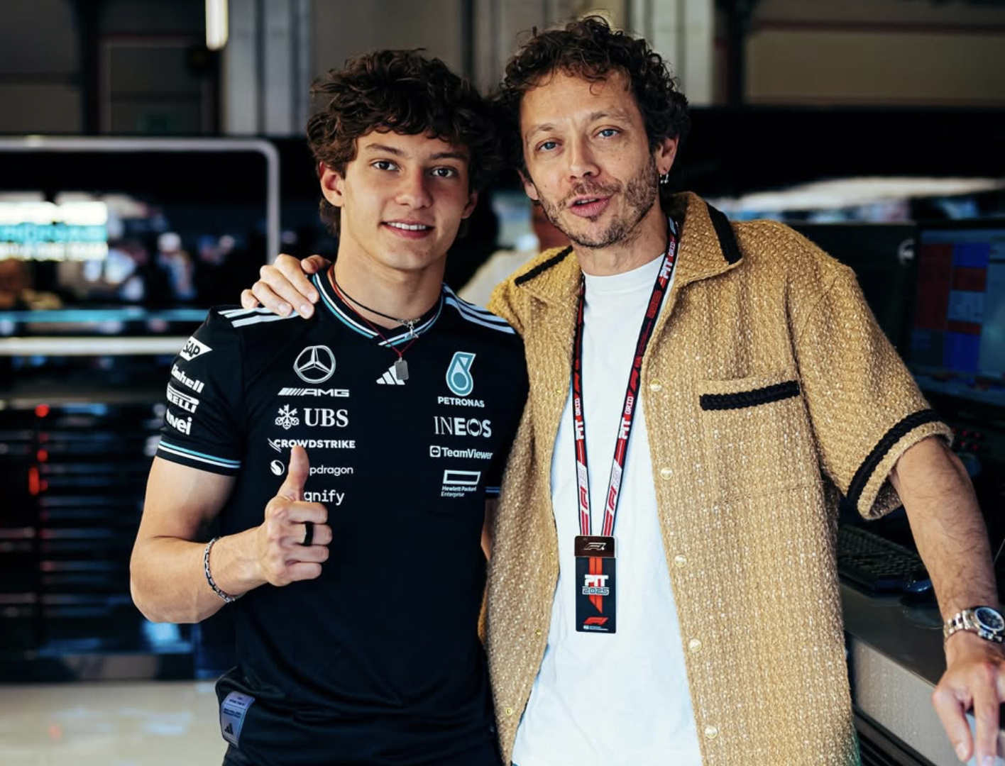 Andrea Kimi Antonelli eut certainement des échanges productifs avec Rossi, alors que le patron de son équipe, Toto Wolff, n’a pas pu faire le déplacement en Italie pour cette manche importante du championnat du monde. Plus tôt ce week-end, le pilote de 18 ans a reçu une autre visite, puisque ses camarades de classe furent conviés à le supporter dans le paddock.