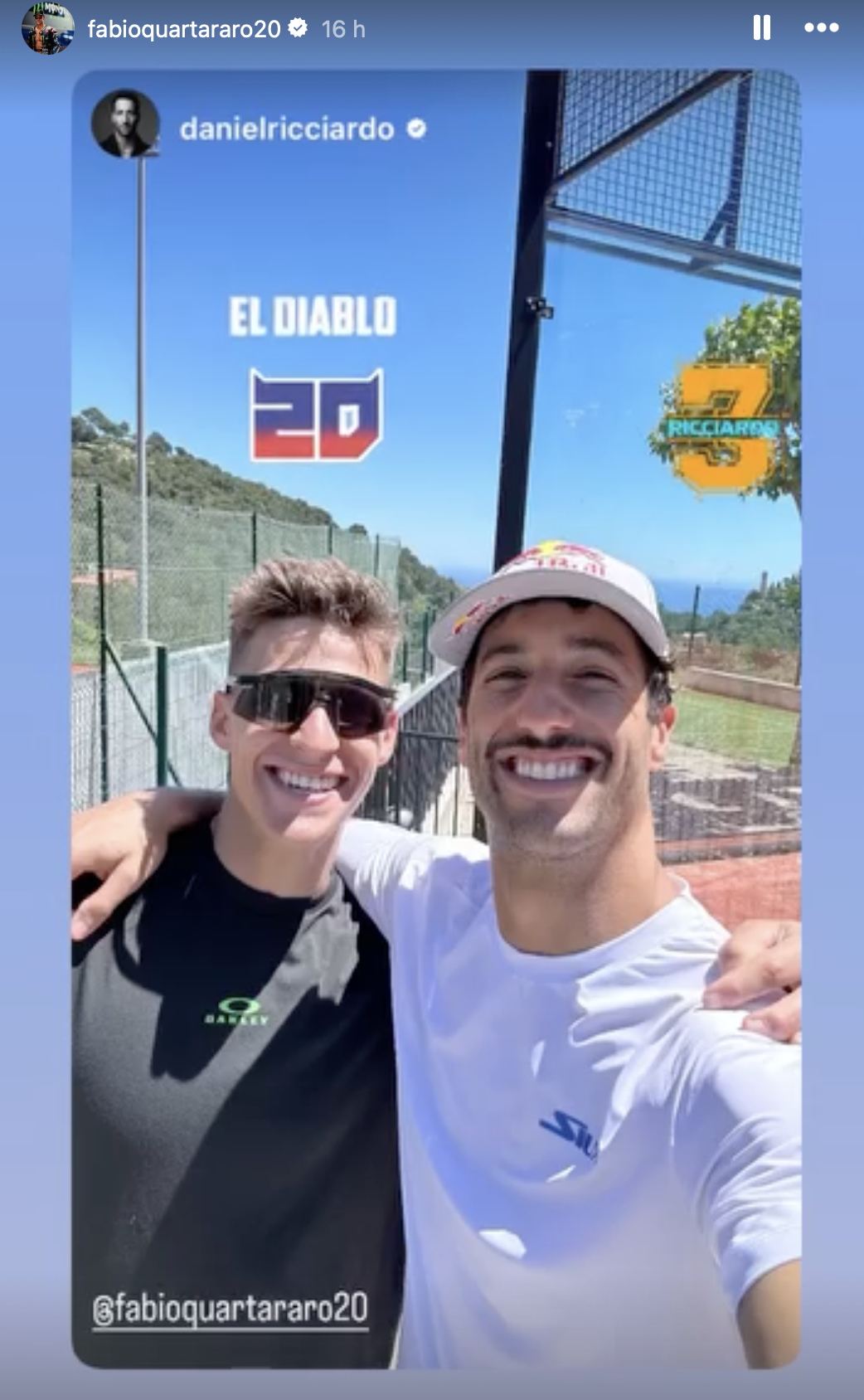 - Le pilote de Formule 1 Australien, Daniel Ricciardo, a publié une photo sur son compte Instagram avec le champion du monde 2021 de MotoGP, Fabio Quartararo.