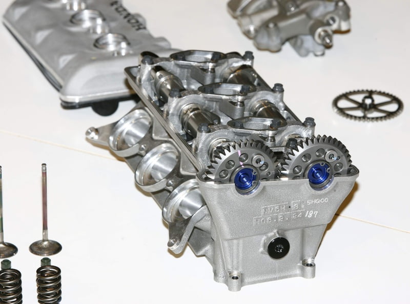 Il y a eu de nombreuses rumeurs à l’époque quant à la taille des cylindres, avec la possibilité d’avoir les 2 cylindres arrière légèrement plus petits, notamment pour des questions de centrage de masses. Honda néanmoins confirmé que les 5 cylindres sont de la même dimension.