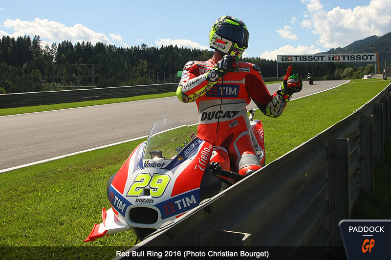 Mais Dovizioso et Dall’Igna, savent, au fond d’eux, que les efforts finiront un jour par payer, en témoigne la conservation de la ligne directrice établie pour le développement. Finalement, et contre toute attente, c’est l’autre Andrea qui fait gagner la machine sur le circuit de Spielberg, six ans après le dernier succès de Stoner.