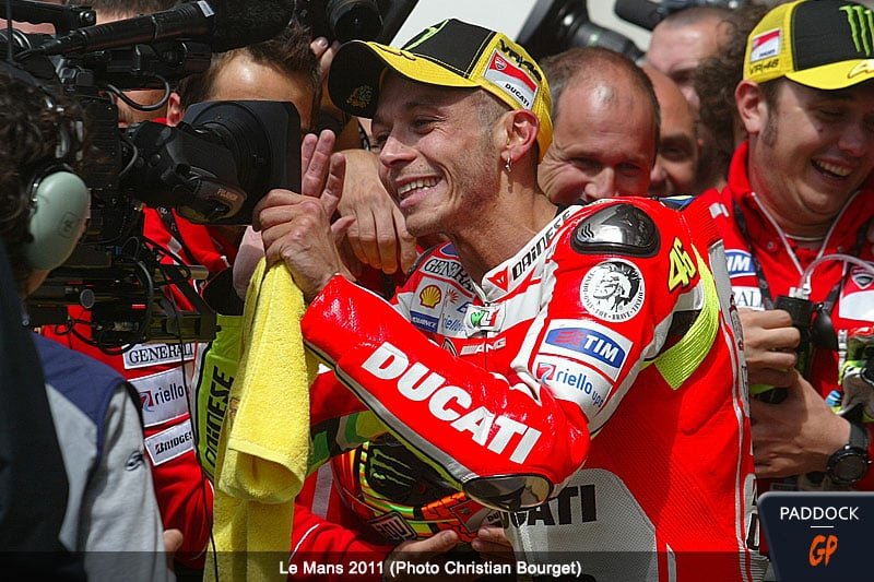 La légende Italienne quitte Yamaha pour Ducati à la fin de l’année 2010, après une saison entachée par cette vilaine blessure. Couvert par la presse, le transfert du siècle fait grand bruit. Signer pour les rouges est un sacré challenge : Si Stoner eut beaucoup de mal à la faire fonctionner les deux années précédentes, que dire de Nicky Hayden, qui lui pataugea, n’ayant qu’une 7e place au général en guise de meilleur résultat.