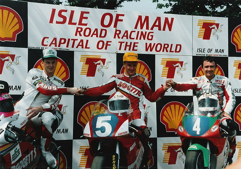 « Hizzy » à gauche, « Foggy » (Carl Fogarty) au centre et « Bob » (Robert Dunlop) à droite. Le trio magique du début des années 1990. Photo : Christof Berger