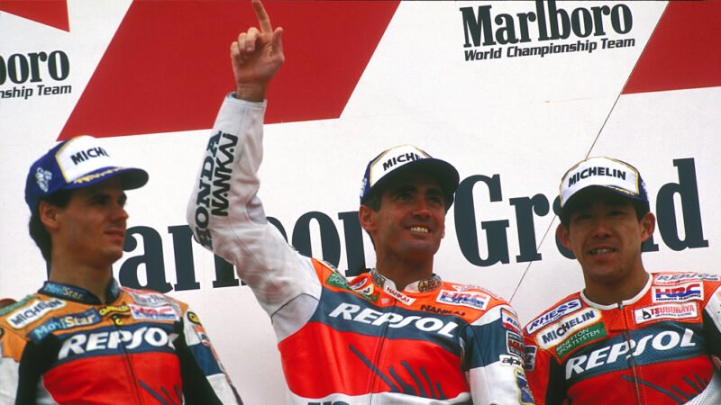Luca Cadalora, à 35, a bien plus brillé. En catégorie 250cc, son run historique (Le Mans 1990 – Eastern Creek 1993) lui permit d’empocher 16 victoires, huit autres podiums, six pole positions mais surtout deux titres de champion du monde d’affilée. Il est d’ailleurs le seul du classement à débuter dans une catégorie et terminer dans une autre, puisque sa première course 500cc se solda par une solide huitième place.