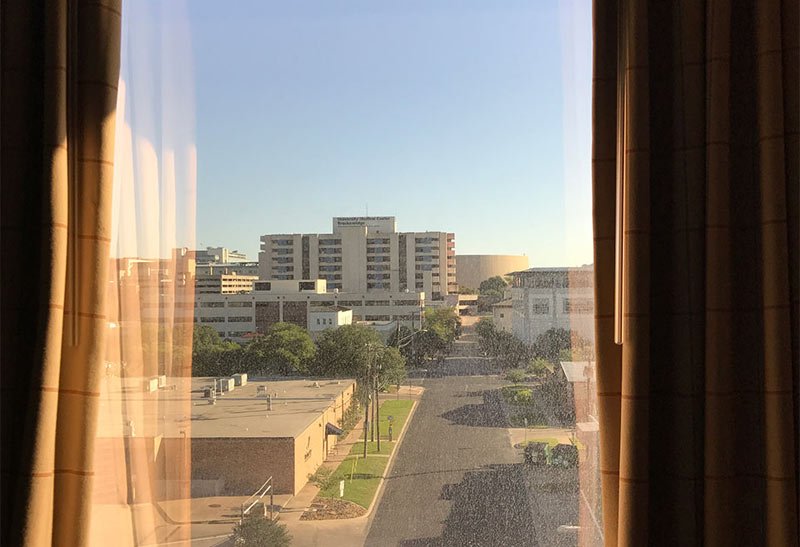 Quand je me suis réveillé jeudi matin, après ma première nuit à Austin, j’ai ouvert le rideau pour laisser entrer la lumière. C’était la chambre 711. Là, de la fenêtre de ma chambre, je pouvais voir un grand bâtiment juste en face de notre hôtel. C’était l’hôpital universitaire de Brackenbridge.
