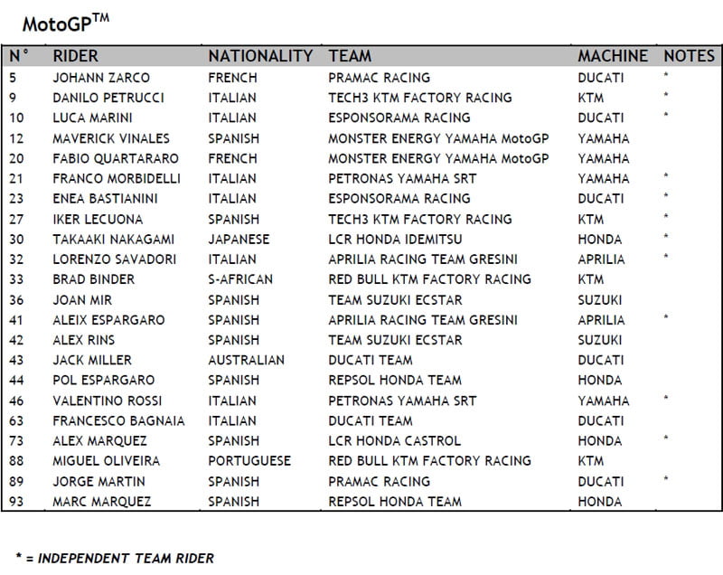 Pas de grande surprise pour cette liste provisoire des pilotes MotoGP en vue de la saison 2021.