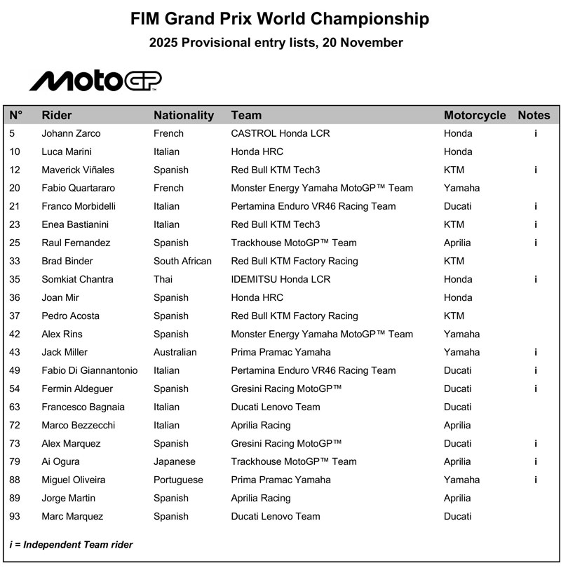 – Sixième du classement général Red Bull KTM Factory Racing récupère l’ex-rookie Pedro Acosta (31) pour venir épauler l’expérimenté Brad Binder (33).