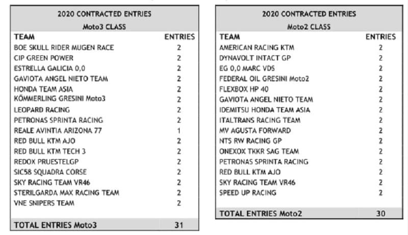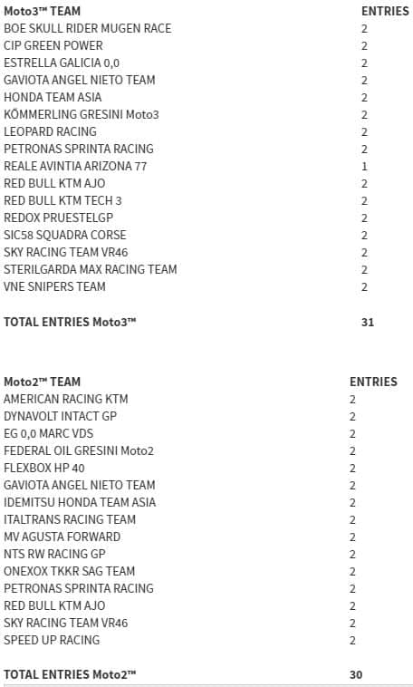 Il y aura quinze équipes en Moto2, après les départs des teams Kiefer et Tasca, et seize en Moto3 après celui du team « Best Capital Dubai » de Fiorenzo Caponera. Par contre en Moto2, Petronas et Gresini passent à deux pilotes au lieu d’un seul cette année. En Moto3, le Max Racing Team passe à deux pilotes et seul Avintia n’en engage qu’un seul : Carlos Tatay, superbe vainqueur de la Red Bull Rookies Cup cette saison.