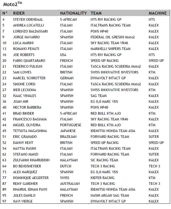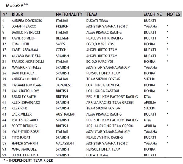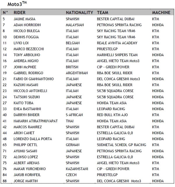 Au total 84 élus, dont 24 pilotes MotoGP, 32 pilotes Moto2 et 28 pilotes Moto3.
