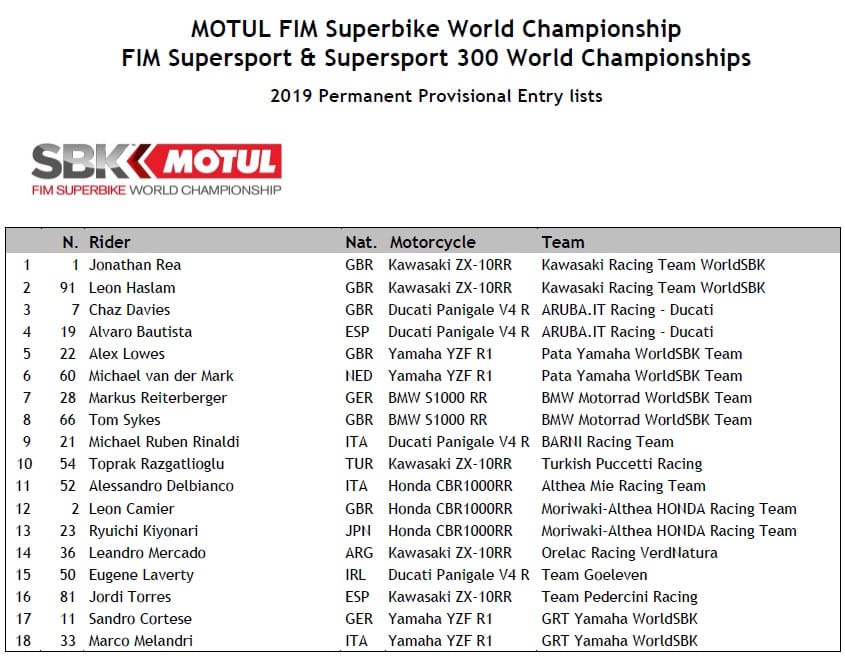Listes provisoires des pilotes des championnats du monde 2019 Superbike, Supersport et Supersport 300