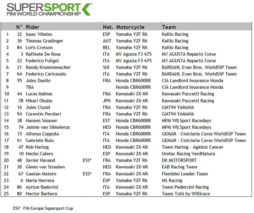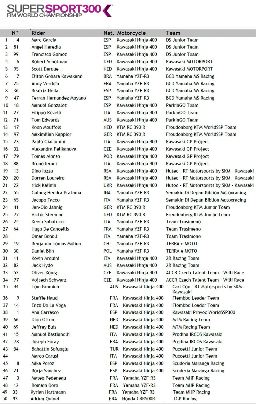 18 concurrents seront présents en Superbike, 23 en Supersport (plus nos 2 Français sur les manches européennes), et pas moins de 50 en Supersport 300.