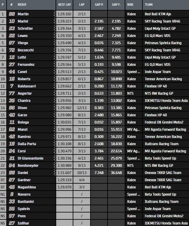 Dès lors, la course semble se stabiliser avec Jorge Martin qui parvient à prendre le large devant Luca Marini, lui-même possédant plus de trois secondes d’avance sur un Marcel Schrötter isolé devant le peloton emmené par Xavi Vierge (Kalex, Petronas Sprinta Racing) et Sam Lowes.
