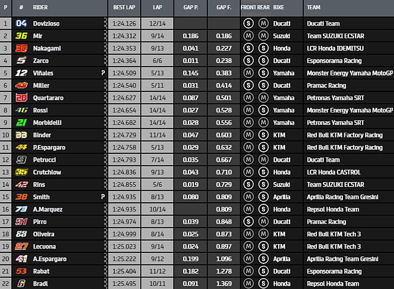 La hiérarchie est alors composée de Joan Mir, Andrea Dovizioso, Maverick Viñales, Jack Miller, Takaaki Nakagami, Fabio Quartararo, Pol Espargaró, Danilo Petrucci, Valentino Rossi et Brad Binder.
