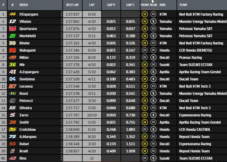 L’enseignement de ce warmup est qu’il faut s’attendre cet après-midi à un affrontement entre les Yamaha, bien sûr, mais aussi les KTM !