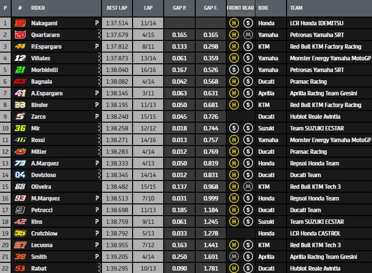 Avant la fin du premier run, Johann Zarco intègre le top 10. La hiérarchie est alors composée de Fabio Quartararo, Pol Espargaró , Francesco Bagnaia, Aleix Espargaró , Maverick Viñales, Jack Miller, Takaaki Nakagami, Álex Márquez, Johann Zarco, Franco Morbidelli, Marc Márquez, Andrea Dovizioso, Brad Binder, Valentino Rossi, Cal Crutchlow, Joan Mir, Iker Lecuona, Danilo Petrucci, Miguel Oliveira, Álex Rins, Bradley Smith, et Tito Rabat qui n’a pas encore inscrit de chronos.