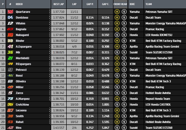 La hiérarchie est alors composée de Brad Binder, Aleix Espargaró , Fabio Quartararo, Francesco Bagnaia, Pol Espargaró , Takaaki Nakagami, Valentino Rossi, Joan Mir, Jack Miller, Franco Morbidelli, Miguel Oliveira, Andrea Dovizioso et Maverick Viñales, mais ce dernier se hisse alors en tête du classement, en 1’37.880.