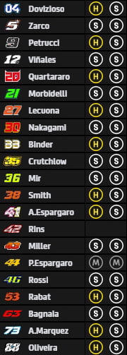 A l’exception de Pol Espargaró, tout le monde a choisi le pneu arrière tendre, ce qui ne sera pas forcément le cas en course, alors que les choix sont partagés en ce qui concerne l’avant.