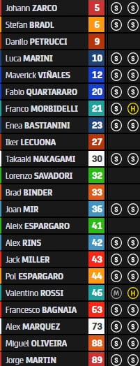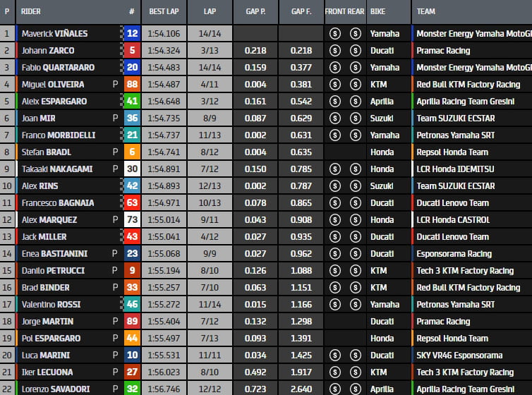 Après un score de 1 partout, la belle était attendue ce « matin », avec pour objectif principal de figurer dans le top 10 des trois premières séances, comme l’étaient déjà Jack Miller, Francesco Bagnaia, Fabio Quartararo, Johann Zarco, Álex Rins, Maverick Viñales, Franco Morbidelli, Aleix Espargaró, Valentino Rossi et Pol Espargaró, malgré les quelques chutes suivantes en FP1.