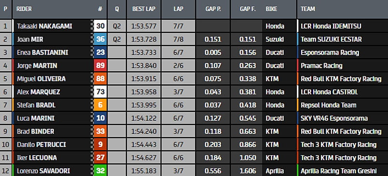 Aux Jack Miller, Francesco Bagnaia, Fabio Quartararo, Johann Zarco, Álex Rins, Maverick Viñales, Franco Morbidelli, Aleix Espargaró, Valentino Rossi et Pol Espargaró, viennent de s’adjoindre Takaaki Nakagami et Joan Mir, repêchés lors de la qualification 1 du Grand Prix du Qatar.