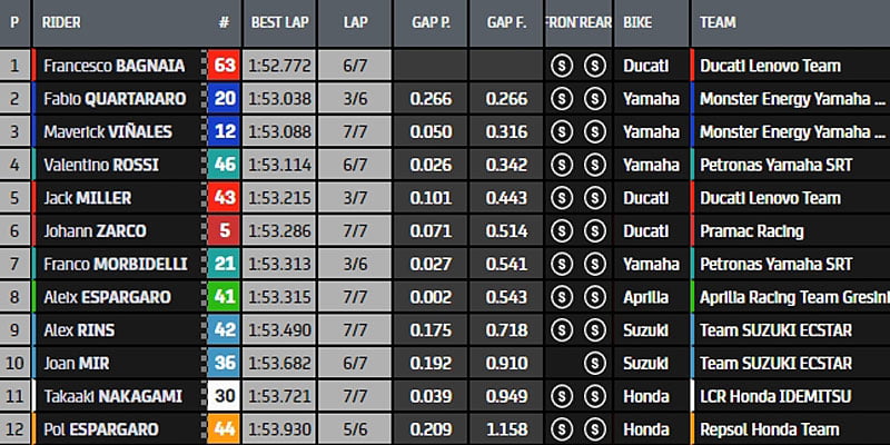 Après cette première tentative, tout le monde rentre au box pour monter un pneu arrière tendre neuf. La hiérarchie est alors composée de Fabio Quartararo, Jack Miller, Maverick Viñales, Francesco Bagnaia, Franco Morbidelli, Aleix Espargaró, Johann Zarco, Joan Mir, Álex Rins, Takaaki Nakagami, Valentino Rossi et Pol Espargaró.
