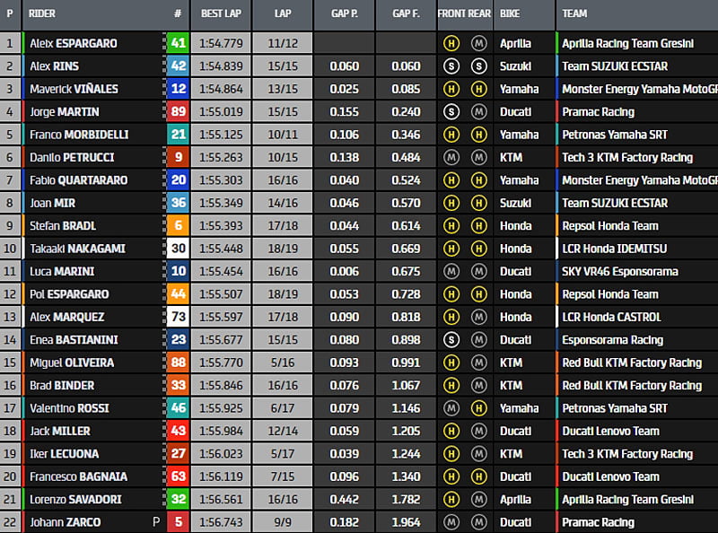En tête, Alex Rins s’est porté à la deuxième position et c’est toujours l’Aprilia qui mène le classement.