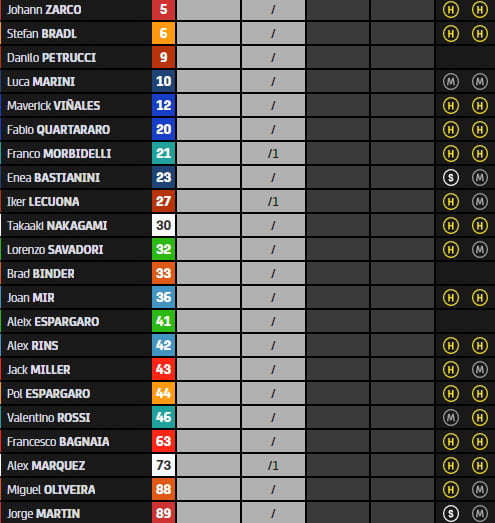 Au moment où Maverick Vinales s’empare du leadership en 1’55.095, on note que quatre Ducati sont en fin de classement, avec Francesco Bagnaia, Lucas Marini, Johann Zarco et Jack Miller précédant seulement Lorenzo Savadori.