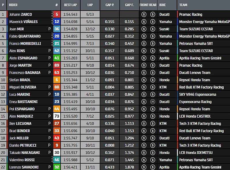 Juste avant la mi-séance, la hiérarchie est composée de Johann Zarco, Maverick Vinales, Fabio Quartararo, Franco Morbidelli, Aleix Espargaro, Miguel Oliveira, Luca Marini, Francesco Bagnaia, Joan Mir, Jorge Martin, Alex Márquez, Pol Espargaro, Iker Lecuona, Stefan Bradl, Enea Bastianini, Alex Rins, Danilo Petrucci, Valentino Rossi, Jack Miller, Takaaki Nakagami, Brad Binder et Lorenzo Savadori.