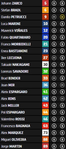 Quasiment tous les pilotes ont opté pour les pneus tendres, à l’exception de Joan Mir et Alex Rins qui ont équipé leurs Suzuki d’un médium à l’arrière, de Danilo Petrucci qui a opté pour un dur sur sa KTM.
