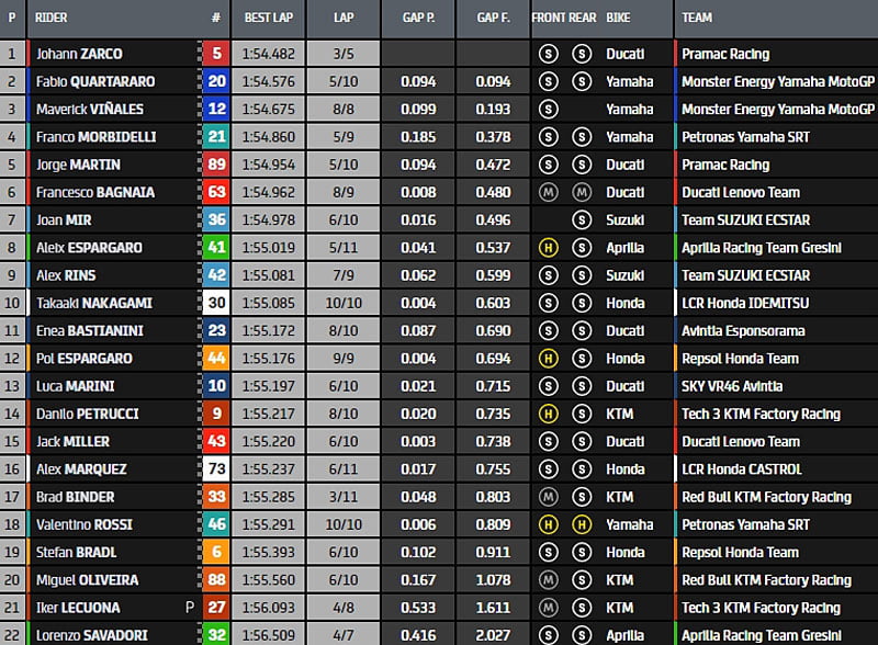 En attendant leurs réponses, on observera les performances non seulement de Jorge Martin, mais aussi de Johann Zarco, Maverick Viñales, Jack Miller, Fabio Quartararo et Francesco Bagnaia, qui occupent les deux première lignes de la grille de départ.