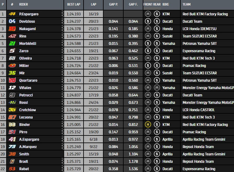 À la fin du premier run, la hiérarchie est composée de Pol Espargaró, Andrea Dovizioso, Danilo Petrucci, Alex Rins, Miguel Oliveira, Takaaki Nakagami, Aleix Espargaró, Johann Zarco, Fabio Quartararo et Valentino Rossi. Les Yamaha semblent à la peine…