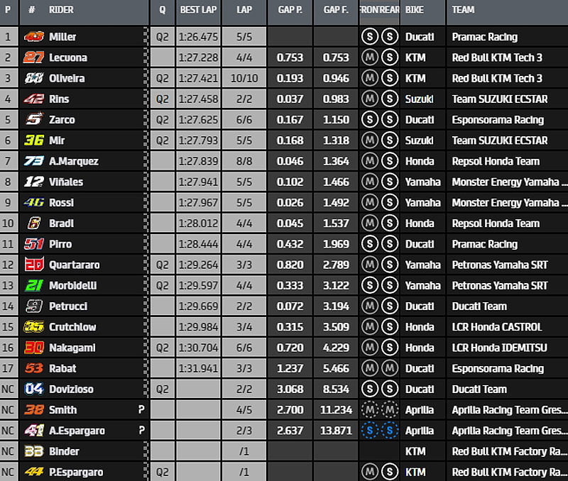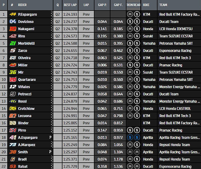 Ce matin, en prévision d’une météo susceptible de se dégrader à chaque instant, Pol Espargaró, Andrea Dovizioso, Takaaki Nakagami, Álex Rins, Franco Morbidelli, Johann Zarco, Miguel Oliveira, Jack Miller, Joan Mir et Fabio Quartararo se sont provisoirement pré-qualifiés pour la Q2.