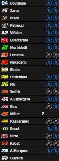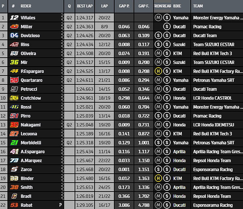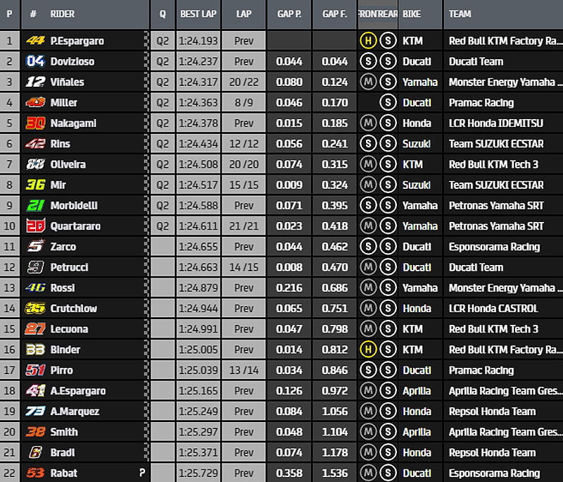 Au final, Pol Espargaró, Andrea Dovizioso, Maverick Viñales, Jack Miller, Takaaki, Álex Rins, Miguel Oliveira, Joan Mir, Franco Morbidelli et Fabio Quartararo iront directement en Q2.