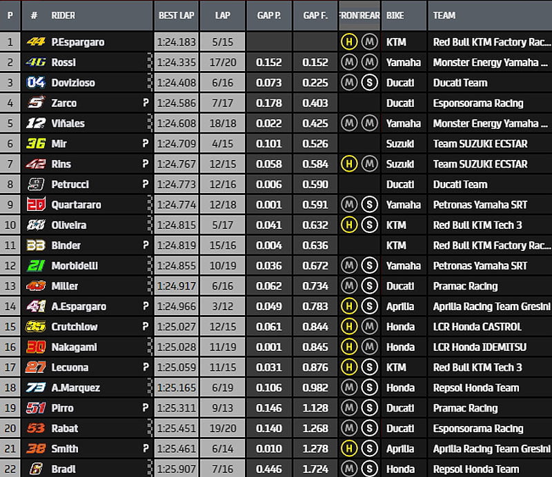 Pendant ce temps, Pol Espargaró, quasiment le seul avec un pneu arrière médium, aligne les tours rapides et montre qu’il sera dangereux, demain en course.