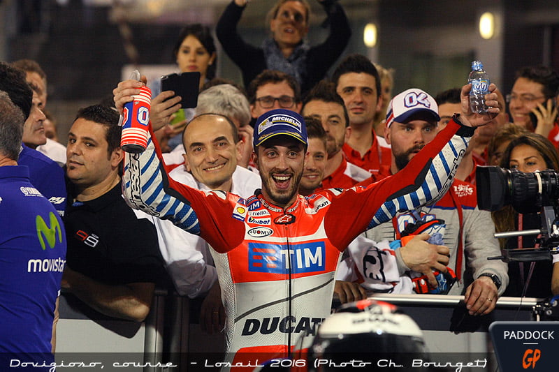 Chez Ducati, Gigi Dall’Igna se déclare « vraiment satisfait du résultat d’aujourd’hui ». Certes les Ducati D16GP sont prometteuses, mais on peut remarquer que le résultat final de ce premier Grand Prix de la saison est néanmoins moins bon que celui de d l’année dernière, la faute, selon Andrea Iannone, à l’adhérence de son pneu avant sur la ligne blanche d’un long virage à droite.