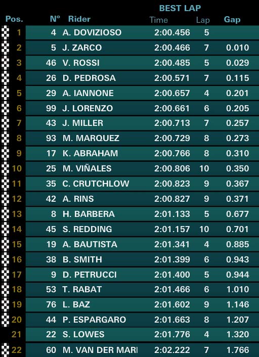 À cinq minutes du drapeau à damier, Johann Zarco se positionne deuxième, à 1/100 du chrono de Andrea Dovizioso.