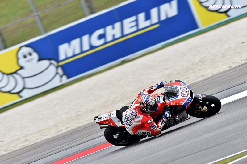 À l’ouverture de la séance, Andrea Dovizioso prend son temps avant de s’élancer et quitte son box au moment où les premiers pilotes y reviennent après un tour pour faire leurs essais de course flag to flag.