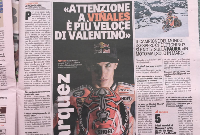 La presse italienne, en l’occurrence Corse di Moto, reporte un extrait d’une interview accordée à la Gazetta dello Sport par Marc Marquez.