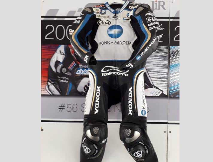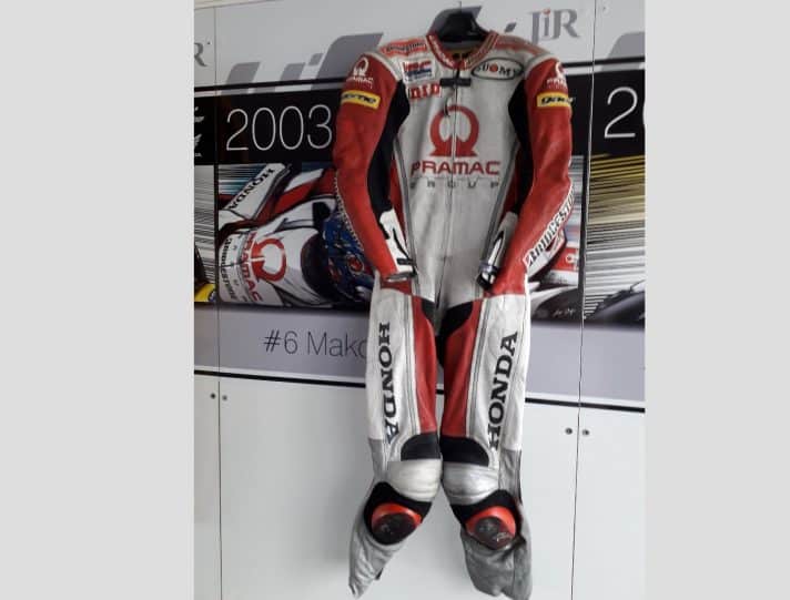 L’une des pièces les plus fascinantes de cette nouvelle proposition est la combinaison portée par Makoto Tamada lors du GP du Brésil 2003. C’était la première fois sur le podium pour le pilote japonais avec la Honda équipée des pneus Bridgestone.