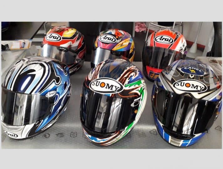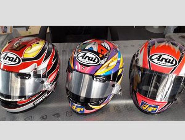 Les casques du champion du monde Tetsuya Harada