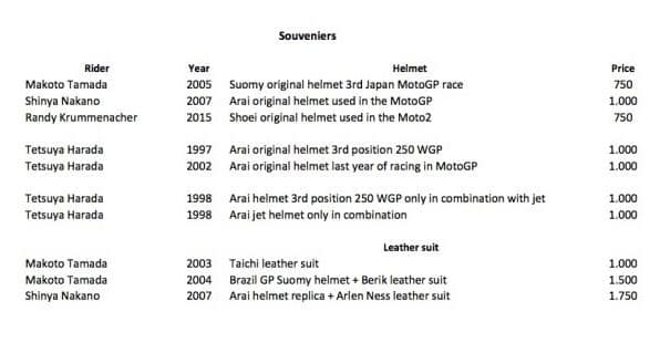 Souvenirs des Grands Prix, les offres continuent pour nos lecteurs. Les lots précédents ont suscité un vif intérêt, venant d’Italie et de l’étranger, et ont été achetés rapidement. Cette fois, nous vous proposons une collection de casques portés par les pilotes japonais dans le championnat du monde. Nous mettons à votre disposition les casques de l’ancien champion du monde 1993 de la catégorie 250, Tetsuya Harada, de 1997 à 1998, saisons au cours desquelles il a piloté l’Aprilia RSV 250 en quête du titre mondial. Jusqu’à la dernière saison MotoGP 2002 avec la Honda NSR 500 : c’est une collection exclusive composée également d’un jet Arai fabriqué à la main pour le pilote japonais.