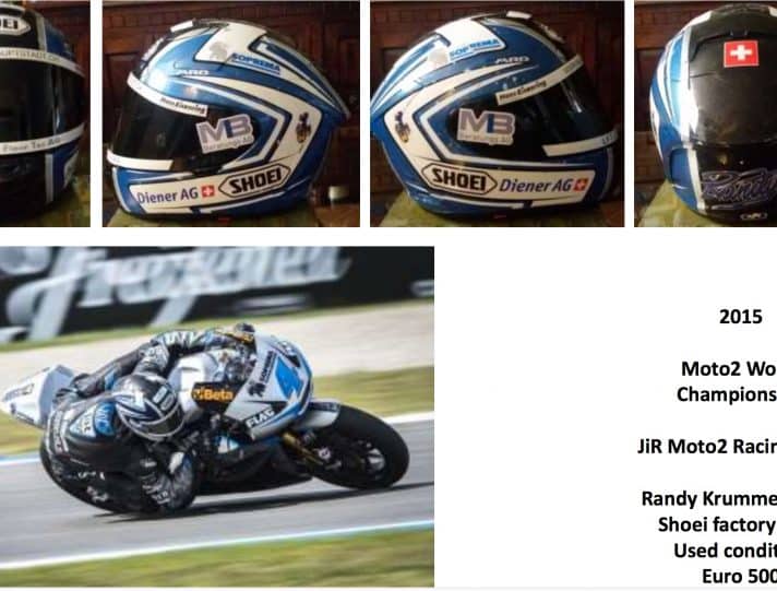Le casque Shoei utilisé par le pilote suisse Randy Krummenacher lors de la saison Moto2 de la saison 2015. Cette année-là, Krummenacher faisait partie du JiR Moto2 Racing Team. Pour info et achats écrivez à [email protected]