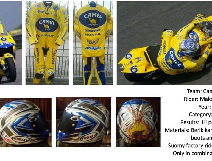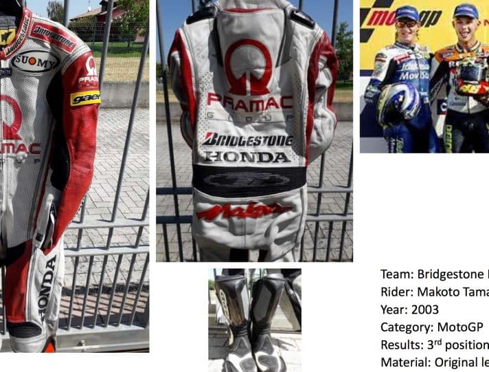 Une véritable page de l’histoire de la course : lors du Grand Prix du Brésil 2004, le Japonais Makoto Tamada a réussi pour la première fois à mettre les pneus Bridgestone sur le devant de la scène. En offre pour les lecteurs de Corsedimoto l’ensemble des vêtements techniques utilisés dans cette circonstance par le pilote japonais : costume, bottes, gants marque Berik kangourou en cuir, en plus du casque Suomi usine, original. En vente l’ensemble. Pour info et achats écrivez à [email protected]