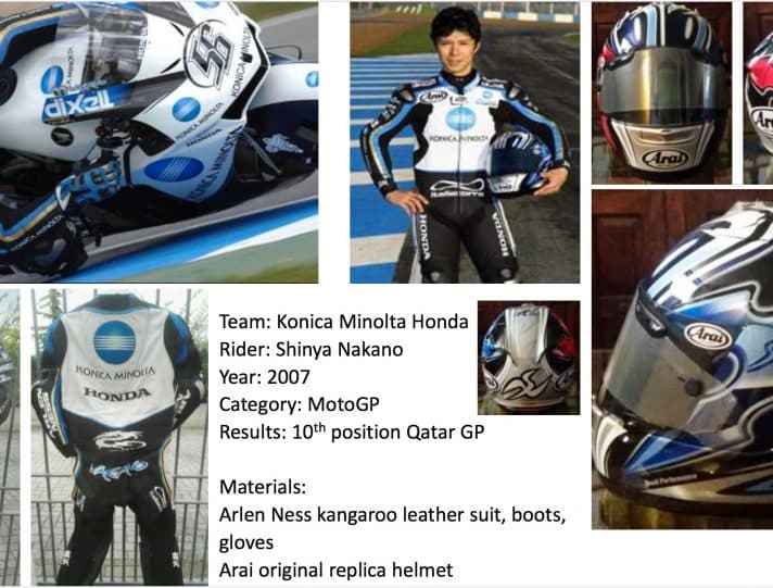L’offre comprend tous les vêtements techniques utilisés par Shinya Nakano lors du GP du Qatar MotoGP 2007. Cette saison-là, Nakano courait avec la Honda du Konica Minolta Honda Team et il a terminé à la dixième place dans cette course. Le forfait comprend : combinaison Arlen Ness, bottes et gants, ainsi que la réplique du casque de l’usine Arai. Pour info et achats écrivez à [email protected]